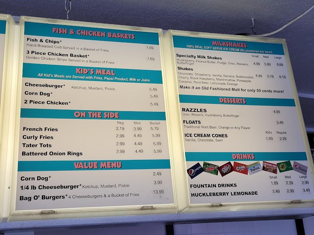 Delicious sides include crispy fries, tater tots, and battered onion rings that add to the experience. Desserts such as floats, ice cream cones, and the well-loved huckleberry shakes round off the offerings. This diverse selection assures there's something for everyone!